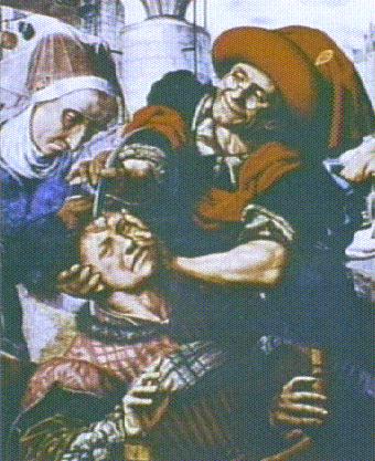 In addition, using bogus brain surgery to "treat" madness, epilepsy and other brain diseases, was very common among medical quacks for many centuries. For example, in the Medieval times, barbers-surgeons roamed the countryside offering a surgery for removing the "stone of madness" or "pierre de follie", which supposedly existed inside the skulls of mentally deranged people.