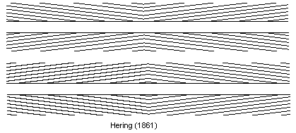 Another illusion of the same kind as Zöllner's was constructed by Hering, and is shown above in two forms. The horizontal parallels are seen bowed outwards in the top figure, and bowed inwards in the bottom figure.