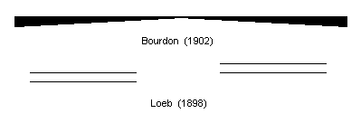 Below are two more geometrical-optical illusions which came along later. In Bourdon's, the horizontal line seems bowed upwards. I do not perceive this illusion distinctly, but you may. Different people do not have the same responses to these illusions, again showing the intervention of the mind. In Loeb's illusion, the bottom of the two parallel lines on the right seems a bit higher than the top of the two parallel lines on the left, whereas in fact the two are in the same straight line.
