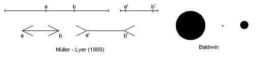 On the left below are two forms of the celebrated Müller-Lyer illusion, in which two lines of equal length seem unequal because of their surroundings. In both cases, the line ab is the same length as the line a'b', which seems a little longer.