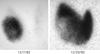 ![]() Imagem planar de baixa resolução obtida com o equipamento, mostrando a concentração maior de radionuclídeo na região de um tumor cerebral. ![]() |
