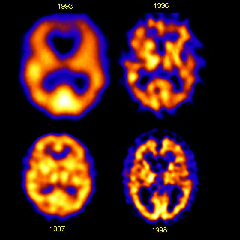 Imagens em falsa cor obtidas com tomógrafo SPECT, mostrando o aumento da resolução obtida com sucessivas gerações de mãquinas, entre 1993 e 1998.