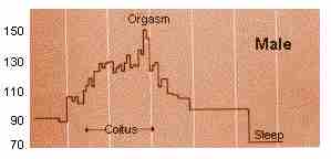 ![]() ![]() Frequência cardíaca durante orgasmo no homem (esquerda) e na mulher (direita). A frequência cardíaca aumentada é a mais comum reação ao estímulo tátil ou estimulação erótica. (Adaptado de 4) |