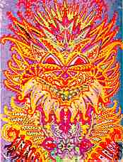 The progressive escape of reality towards delusion is expressed in the pictures below. They have been painted by Louis Wain, an European artist in the beginning of this century. Since Wain was young, he used to draw and paint cats for calendars, albums, postcards, etc. When he became 57 years old, he was affected by schizophrenia, which overtook his life as well his art. The last 15 years of his life were spent in psychiatric institutions. His cat's paintings started to change and to show startling images. Quite revealing of his psychotic condition were the cat's eyes. See how they become fixed with hostility, even in the earliest paintings, because the psychotic probably tends to think that the world is looking upon him in a menacing way. Another sign is the fragmentation of the cat's body. They become altered in a strange way under the psychotic's gaze, and almost always are represented as distorted and phantastic shapes.