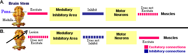 ![]() Systems that inhibit movement in REM sleep. A. In normal REM sleep the pons strongly activates the inbibitory center in the medulla. The midline inhibitory zone in the pons inhibits the lateral locomotor strip (not shown here, see next figure). The result is complete paralysis. B. In REM sleep without paralysis the lesions break the connections from the pons to the locomotor strip and to the medullary center. |