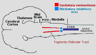 ![]() In REM sleep the pons is activated, exciting the medullary inbibitory area by projections (tegmento-reticular tract) which connects the pons to the inhibitory center. The medullary center inhibits the motor neurons and gives rise to atonia. |