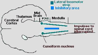 ![]() A lateral locomotor strip, down the outside of the brain stem, plays an important role in the reduction of motor drive. It is connected to structures in the spinal cord. In REM sleep the pons stimulates the inhibitory zone, turning off the locomotor strip and shutting down motor drive. |