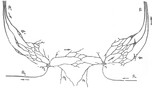 Deiters sugeriu cautelosamente pela primeira vez, que as terminações dos axônios pareciam se fundir com os dendritos de outras células, formando uma espécie de ponte, ou anastomose. Joseph von Gerlach, que já era bastante famoso na época. propôs que os impulsos nervosos recém-descobertos por seus colegas alemão Emil du Bois-Reymond e Julius Bernstein, propagariam-se de célula para célula através desses filamentos, de tal forma que o cérebro parecia ser uma gigantesca rede, ou retículo, com um número assombroso de tais filamentos interconectados em um sincício. A idéia foi universalmente adotada, e pelo menos até 1890 ela era ainda a predominante, em contraste com os que defendiam que o neurônio não se fundia com os outros. Verdade seja dita que Von Kölliker propôs que apenas os dendritos se fundiam. Veremos que tanto von Kölliker quanto von Waldeyer foram personalidades muito importantes, no final do século, no apoio à essa teoria, chamada de doutrina neuronal, baseada grandemente nos achados do anatomista espanhol Santiago Ramón y Cajal.
