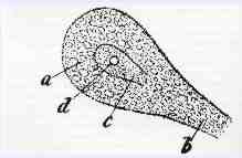 Desenho de um neurônio por Gabriel Valentin, mostrando o protoplasma (a), o núcleo (c), o nucléolo (d) e o cone axonal (b). |